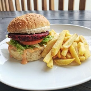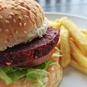 customizable Beetroot and bean patty served on a sesame bun with chips & salad.