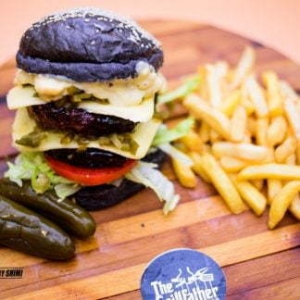 customizable 2x 180G pure beef patty served on a charcoal infused sesame bun with mozzarella cheese & fresh jalapeno chillies with chips & salad.