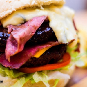 customizable 2x 180G pure beef served with slice of macon & cheesy jalapeno sauce on a sesame bun with chips & salad.