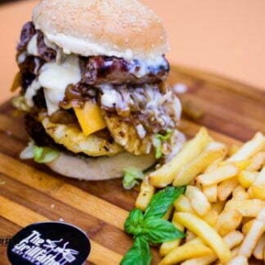 customizable 2x 180G pure beef patty served on a sesame bun with boerewors, pineapple, cheese, mushroom sauce with chips & salad.